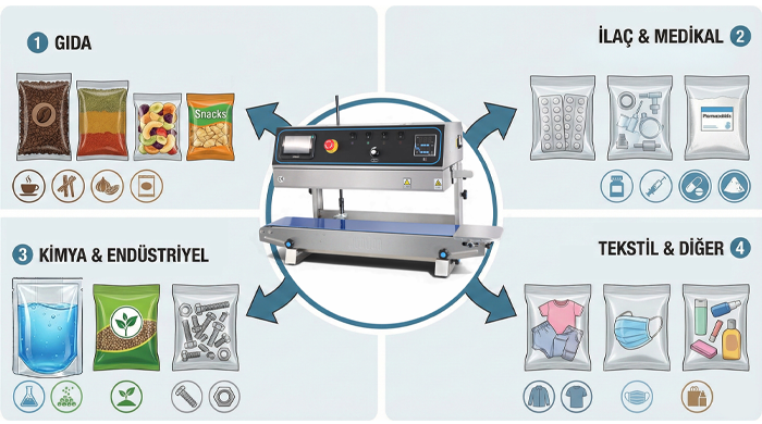 Otomatik dikey poşet yapıştırma makineleri ise poşetin ağız kısmının yukarıda olduğu dikey çalışma düzenine uygun üretim alanlarında kullanılır; sıvı, granül, toz veya hacimli ürünlerin paketlendiği gıda, kimya, tarım, kozmetik ve temizlik sektörlerinde dik duran poşetlerin güvenli ve düzgün biçimde kapatılması için ideal çözüm sunar.